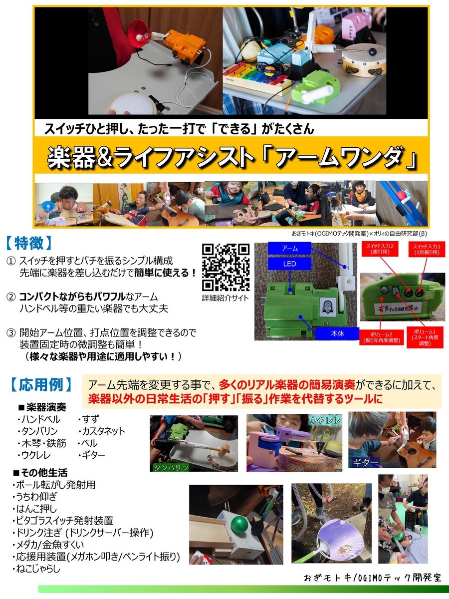ハンドベル、打楽器、ギターなどのリアル楽器はもちろん、そこから派生して、ボール転がし、応援装置、など手が動かすのが難しい方がスイッチ一つで「押す」「ひっぱる」などの動作を支援する、まさに『ライフサポート(生活支援)』として活用例が広がっています。